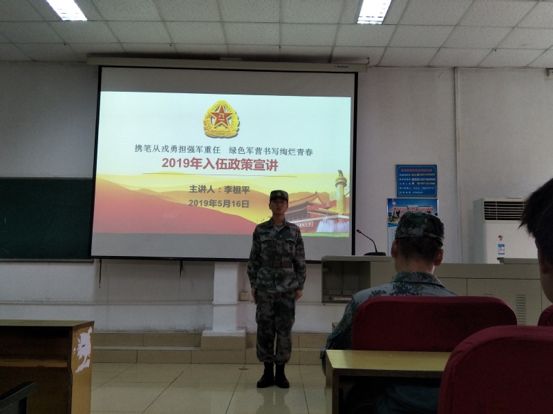 宣讲前,2017级工程造价专业的杨阳、2018级材料科学与工程专业的龚万峰分别分享了自己参军入伍的经历和感想,表示应征入伍让自己接受了一次思想洗礼,体会到了强烈的使命感和荣誉感,将终生难忘。