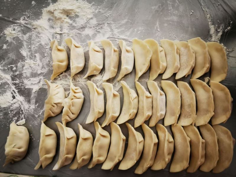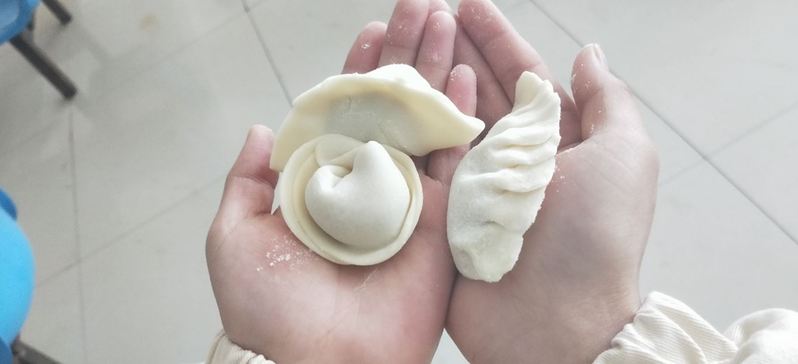 包饺子过程中还穿插进行“最精致饺子”比赛,每个人选择自己包最好的饺子参加比赛,大家都在积极参与,并且发挥着自己的想象包着独具特色的饺子。