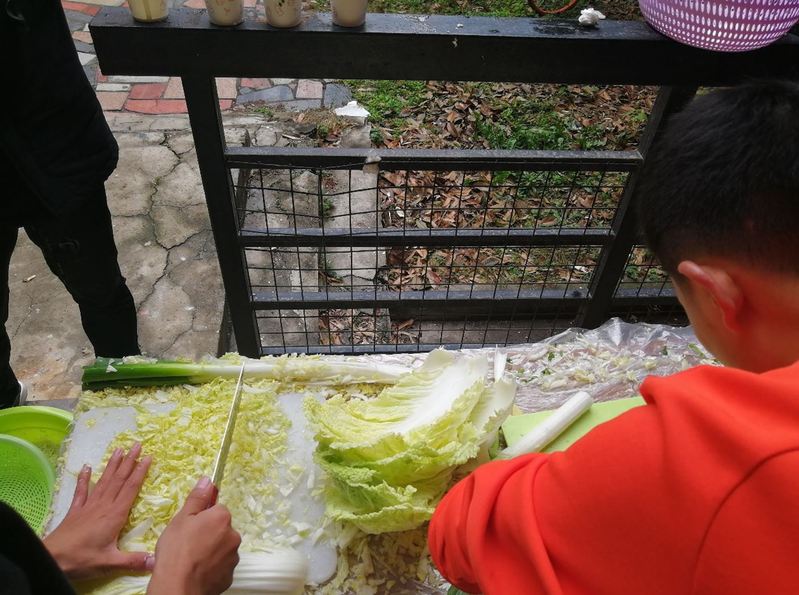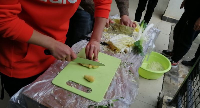 活动伊始,饺子皮和肉馅还没登场,同学们早已迫不及待挽起袖子准备大干一场。从选材料,清洗蔬菜,切蔬菜,剁肉到调馅,每一道工序都由同学们默契配合,亲手完成。