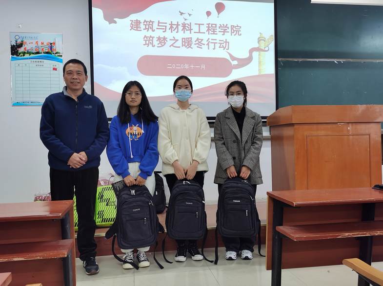 11月19日下午,院长王超参加学院分团委、学工办组织的“筑梦·暖冬行动”,为我院5名学生送上生活用品、为16名学生送去过冬棉衣。邢宽广、叶素珍、池家飞等参加爱心传递活动。