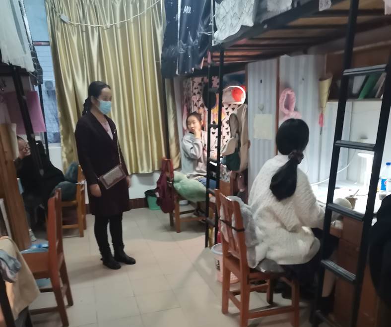 叶素珍不时对各寝室的学习氛围、室友关系等提出建议,并检查了寝室文明公约、安全宣传单的张贴情况。她在走访2021届学生寝室时,提醒大家在全身心投入学习的同时也要做好宿舍卫生,并希望他们放宽心态,扎实做好毕业就业的前期各项准备。