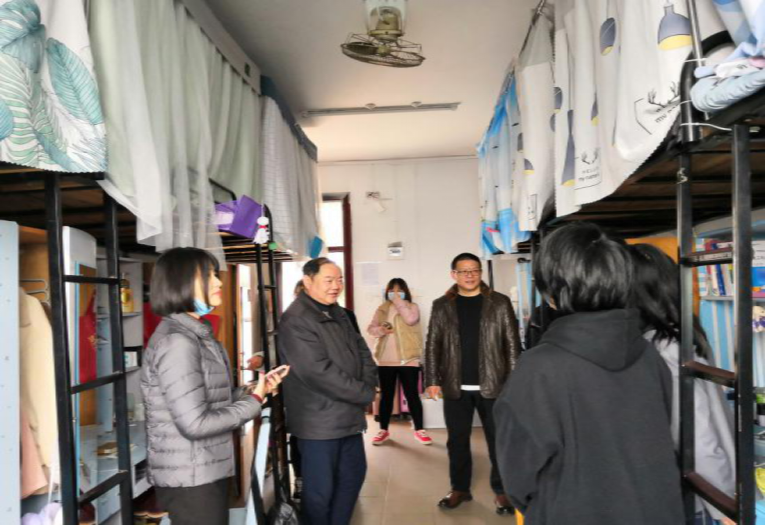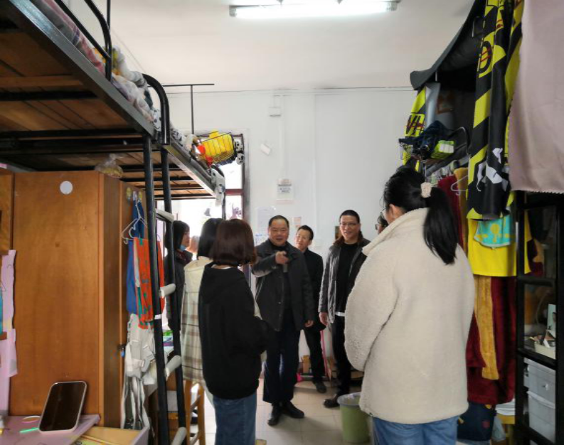 邢宽广与乐三明不时与同学们交谈,对同学们强调不使用违规电器、离寝后断电关窗等安全知识。叶素珍与代黎明走访时注意到学生在寝室门口贴对联、墙纸等装扮寝室,丰富寝室文化,对此提出赞赏。
