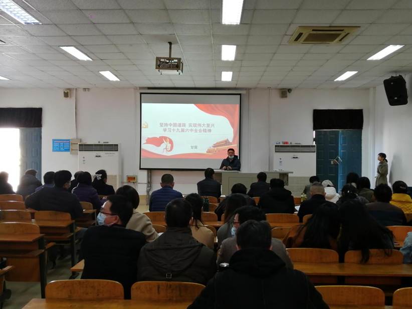 甘露老师以《坚持中国道路,实现伟大复兴》为主题作专题报告。她从党的十九届六中全会的基本情况、全会核心与要义和学习贯彻落实十九届六中全会精神等三个方面,以数字的方式归纳出“1次重要的会议”“2个确立”“3个需要”“4个历史时期”“5个方面历史意义党的百年奋斗”,深入浅出的进行了全面讲解。她在报告中着重从马克思主义政党的重要原则的理论维度、中华民族站起来富起来强起来重要经验的历史维度、全面建设社会主义现代化强国重要保障的实践维度就坚持“两个确立”作了详细阐述,号召广大教职员工增强“四个意识”,坚定“四个自信”,坚决做到“两个维护”。