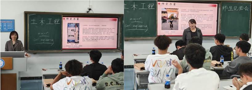见面会开始,在聂老师的介绍下土木一班全体成员对领导老师们的到来表示热烈欢迎,聂琼在土木专业宣传片播放后表示土木专业有行业转型机遇好、校企合作平台好、未来行业前景好的三好专业优势,并向23级土木新生讲述了本院系的师资力量并请毕书记与各科授课老师发言。