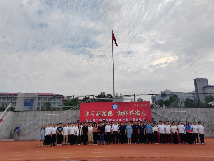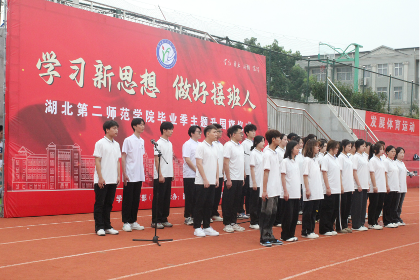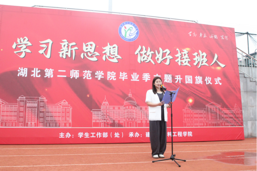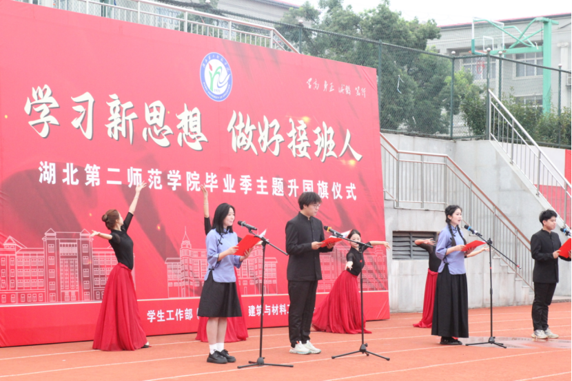 本次活动是以“学习新思想•做好接班人”为主题,旨在让全体毕业生代表在离别之际经受一次爱国爱校荣校的深切洗礼。一心向党,忠心报国,升旗仪式环节,国旗由在校大一、大二、大三学生传递给大四毕业生,国旗护卫队接旗后,在全体师生注目下向国旗行注目礼并升旗。在庄严的国旗下,2020级毕业生杨虹虹等8位毕业生带来诗歌朗诵、舞蹈《我对母校说》。建筑与材料工程学院青年教师代表余琳琳发言。由35名毕业生组成的合唱团歌曲《向往》,唱出对未来的向往和对梦想的追求。