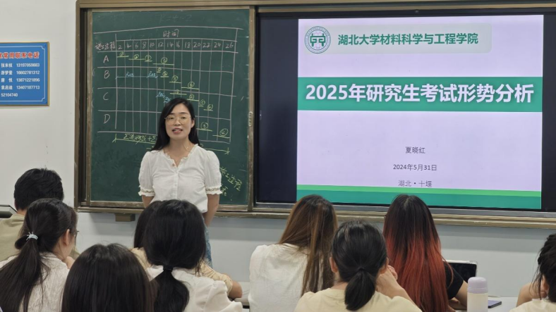 本网讯(通讯员 马琪东)为帮助建筑与材料工程学院学生明晰考研形势、备考方法、以及准确进行自我定位与做好学业规划,2024年6月12日下午,湖北大学材料科学与工程学院副院长夏晓红教授受邀莅临我院作考研政策宣讲与学业规划指导交流会,参加本次交流会的有学院党委副书记陈凌云、学工办主任叶素珍、倪佳苗博士以及我院材料科学与工程专业学生。